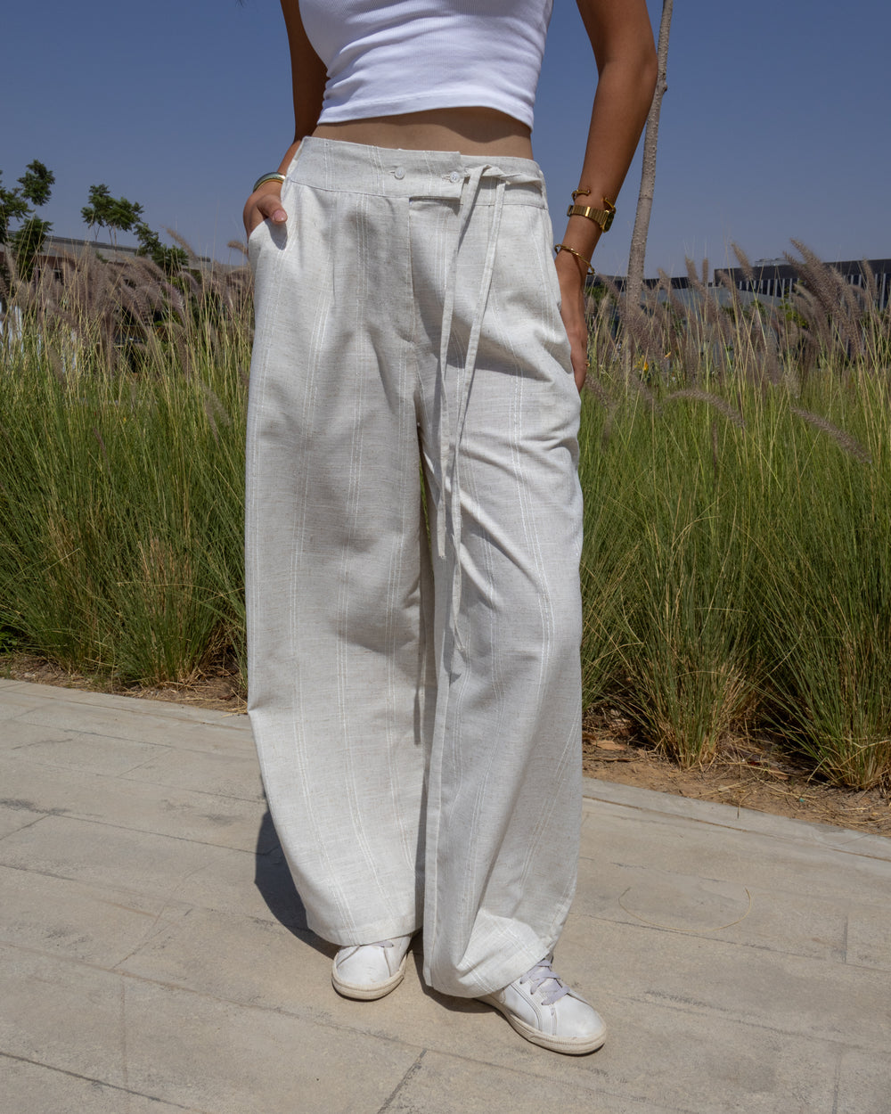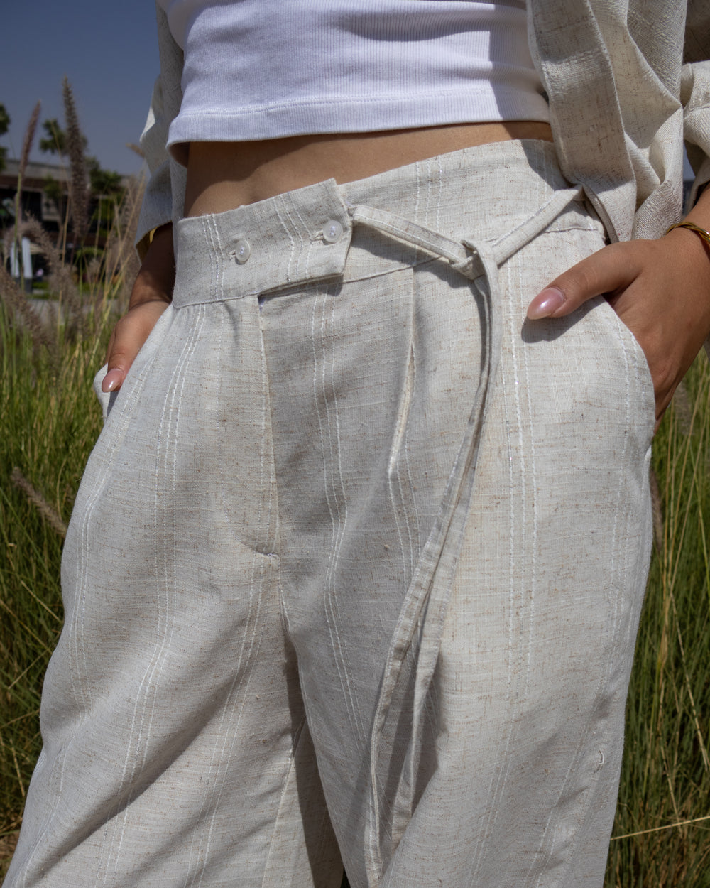 Featuring a wide-leg silhouette and tailored seam detailing, the standout feature is the crossed side belt that adds structure and style. The off-white base is enhanced with subtle vertical stripes for an elongated, elegant look.