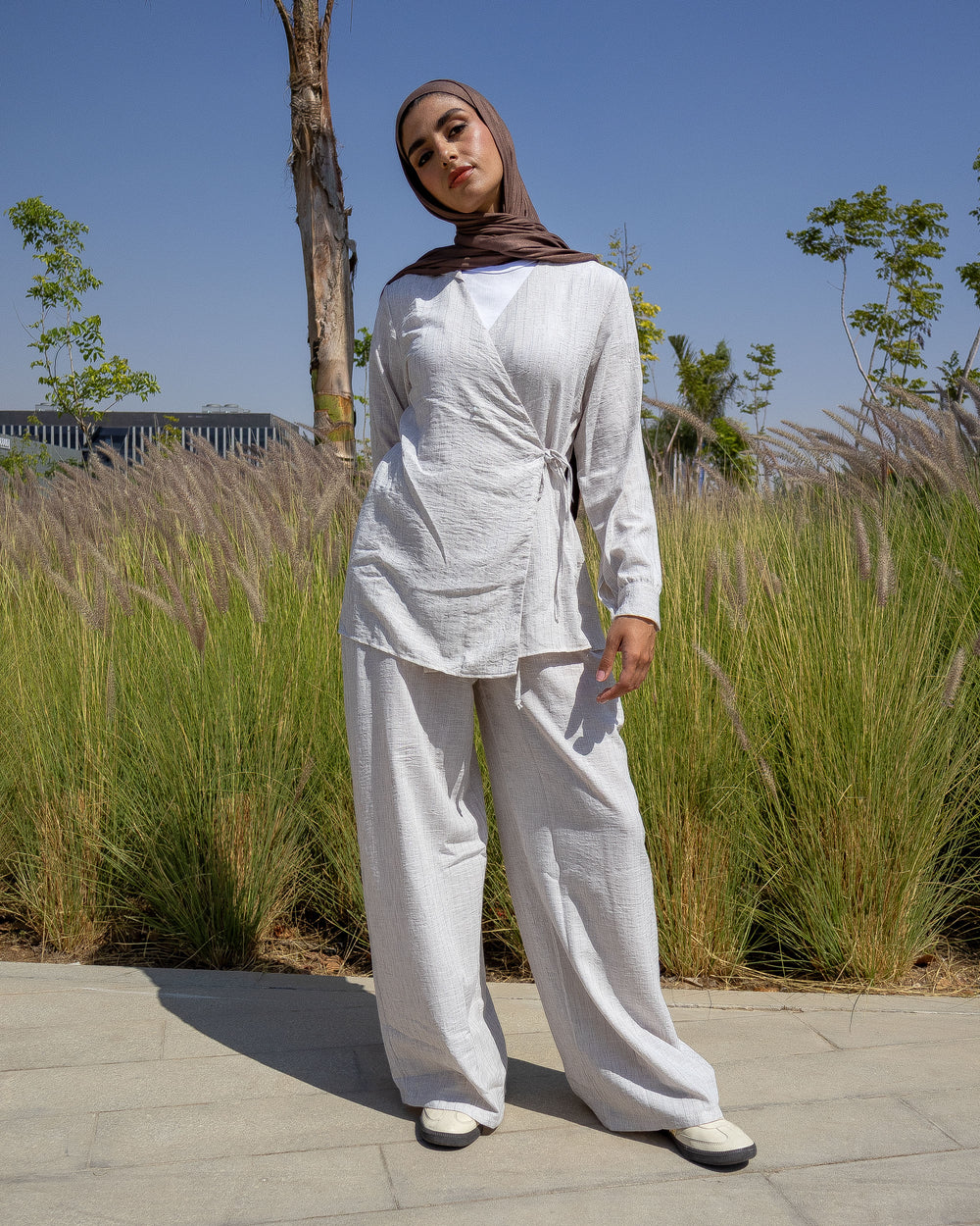 The wrap-style blouse features a subtle V-neck and a side ribbon tie for a flattering, adjustable silhouette. Paired with matching wide-leg pants, the textured fabric flows smoothly for a comfortable yet elevated feel.