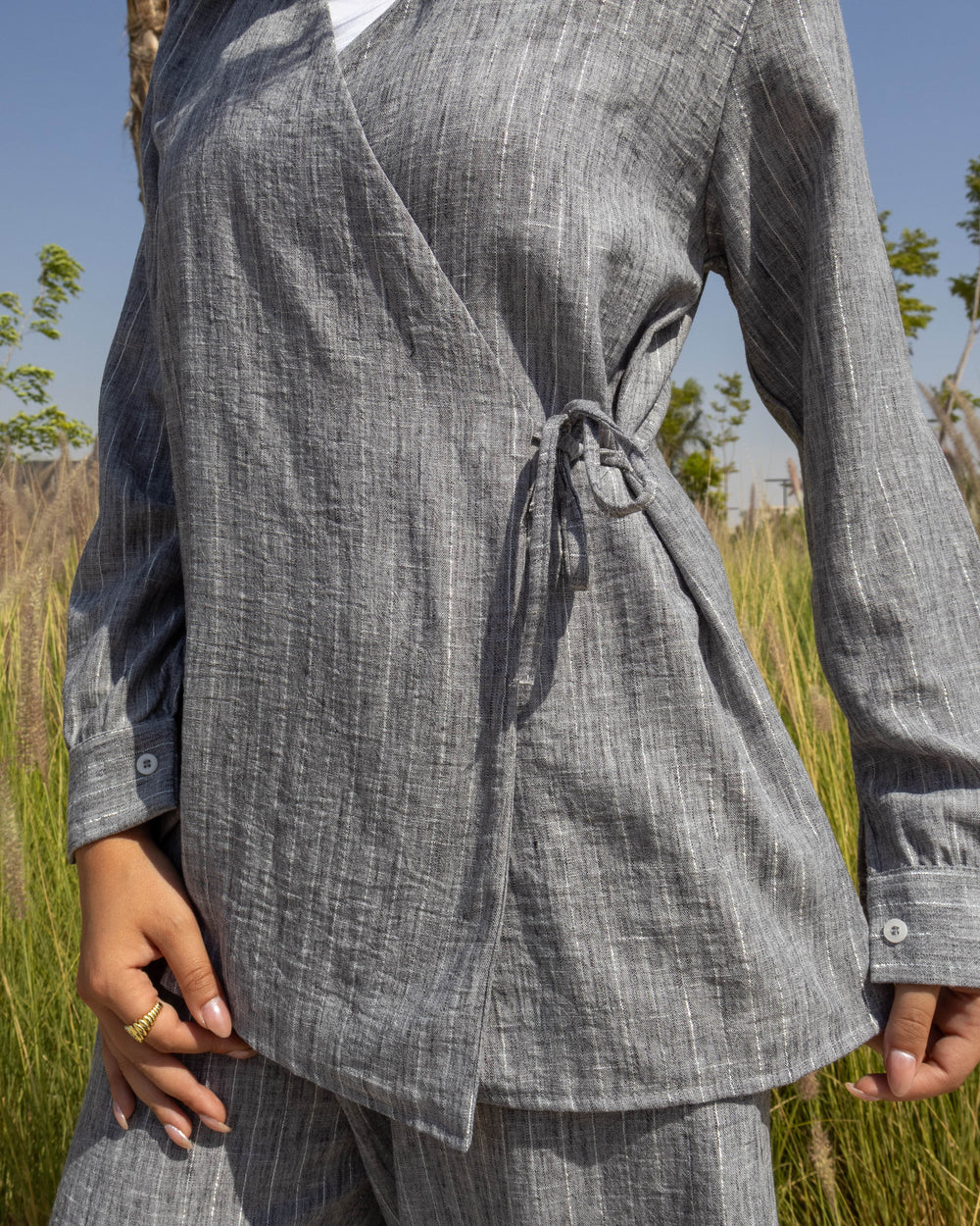The wrap-style blouse features a subtle V-neck and a side ribbon tie for a flattering, adjustable silhouette. Paired with matching wide-leg pants, the textured fabric flows smoothly for a comfortable yet elevated feel.